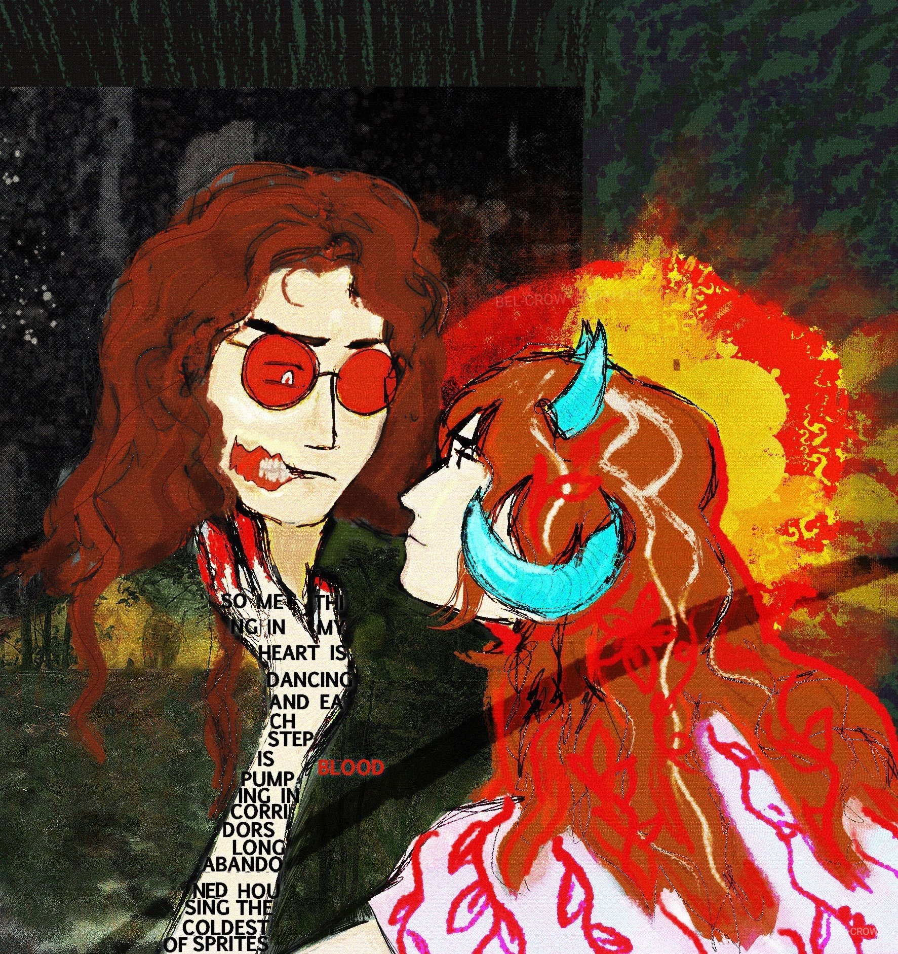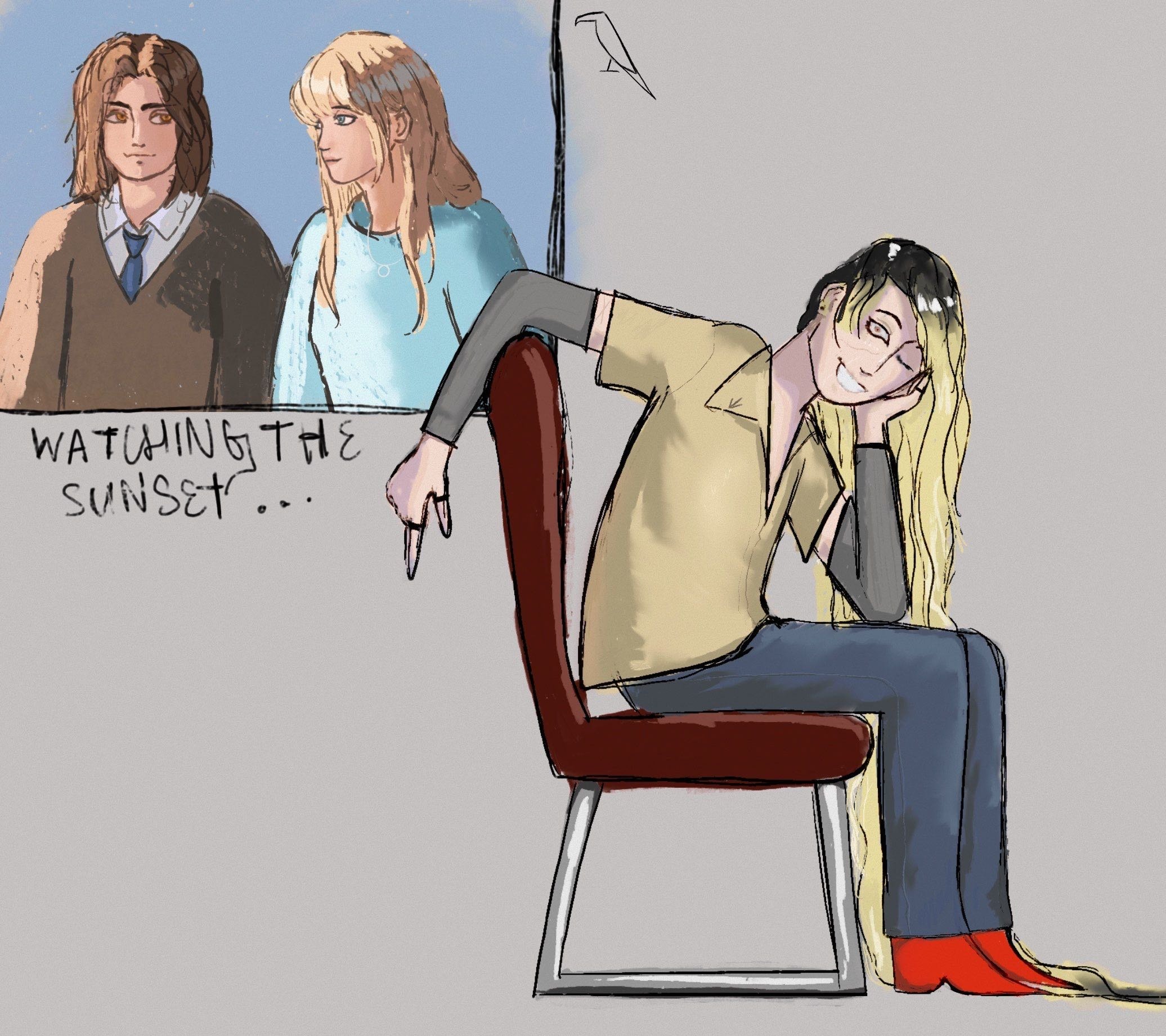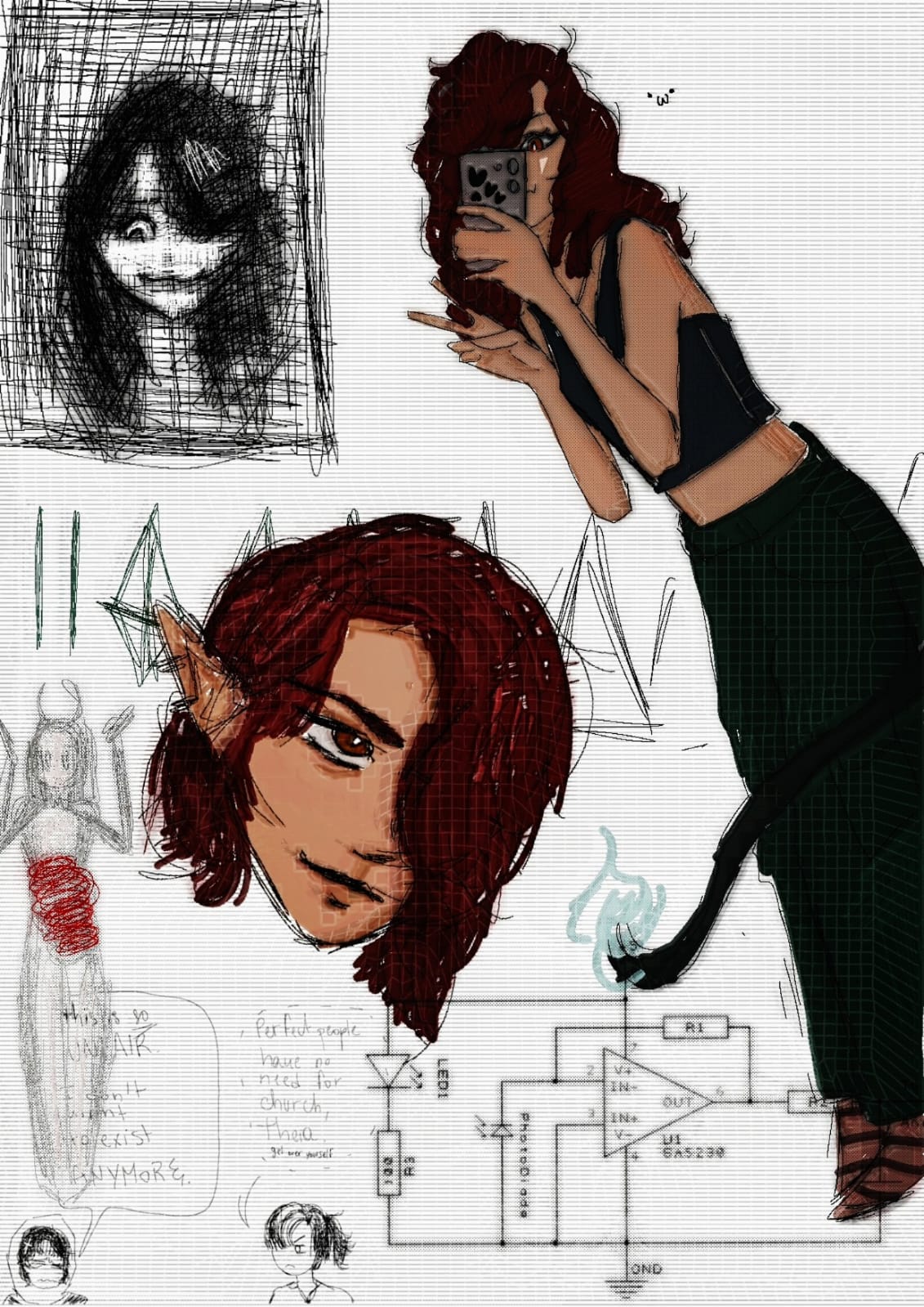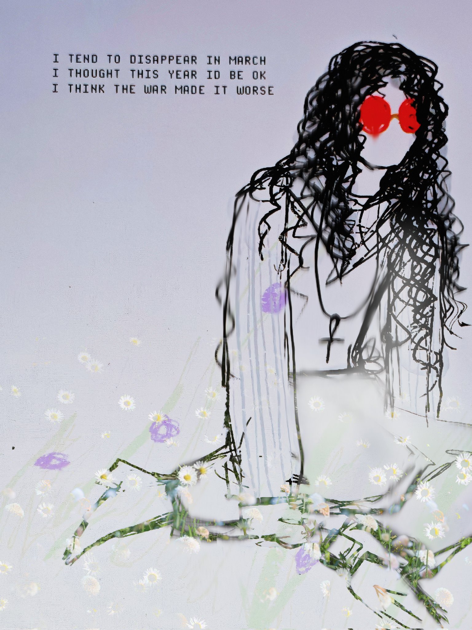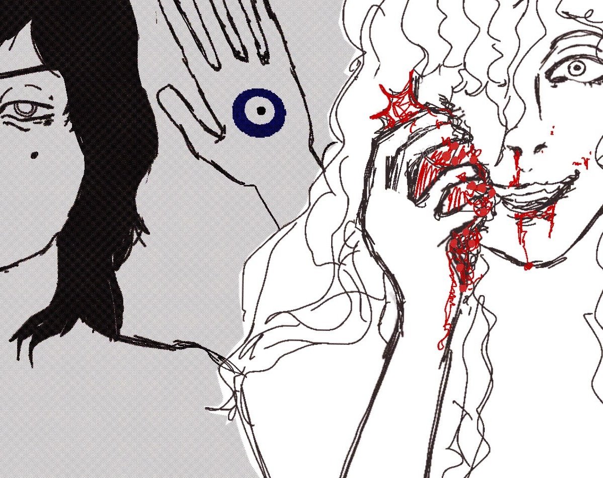 It was after a long night out with people Raph had met online. Her heavy boots dragged across the floor as she entered her bedroom, trench coat barely clinging to her shoulders. She slumped onto the kitchen stool she'd claimed for her room, deliberately avoiding to look behind her, at her bed. The hallucinations had become routine - tonight, she was too tired to face them.