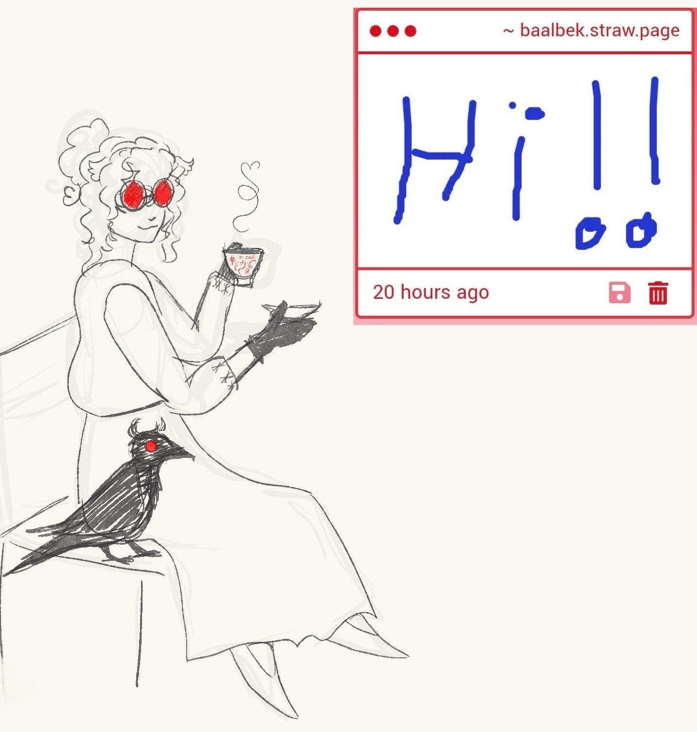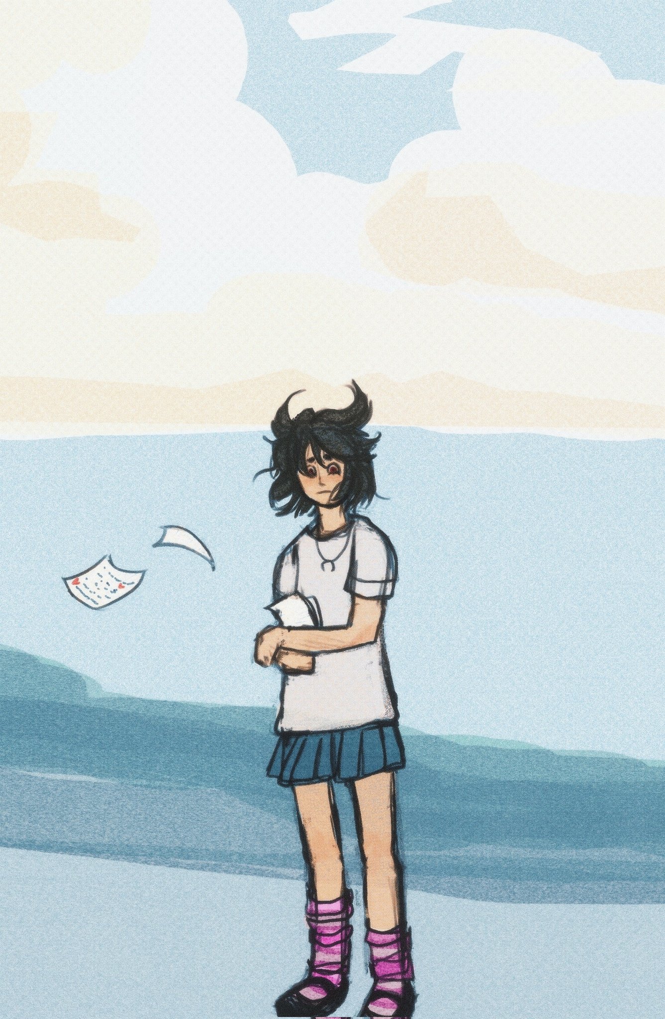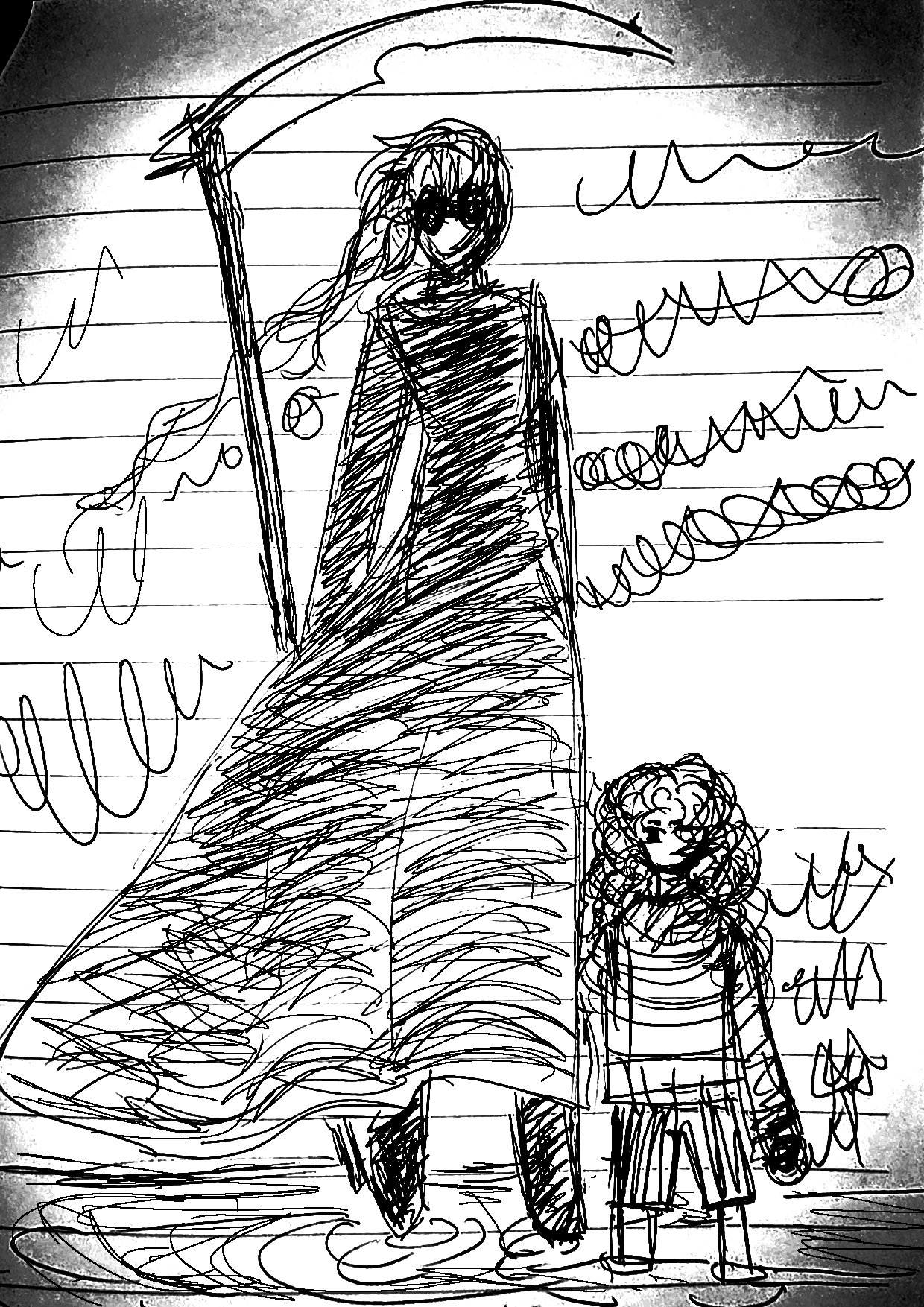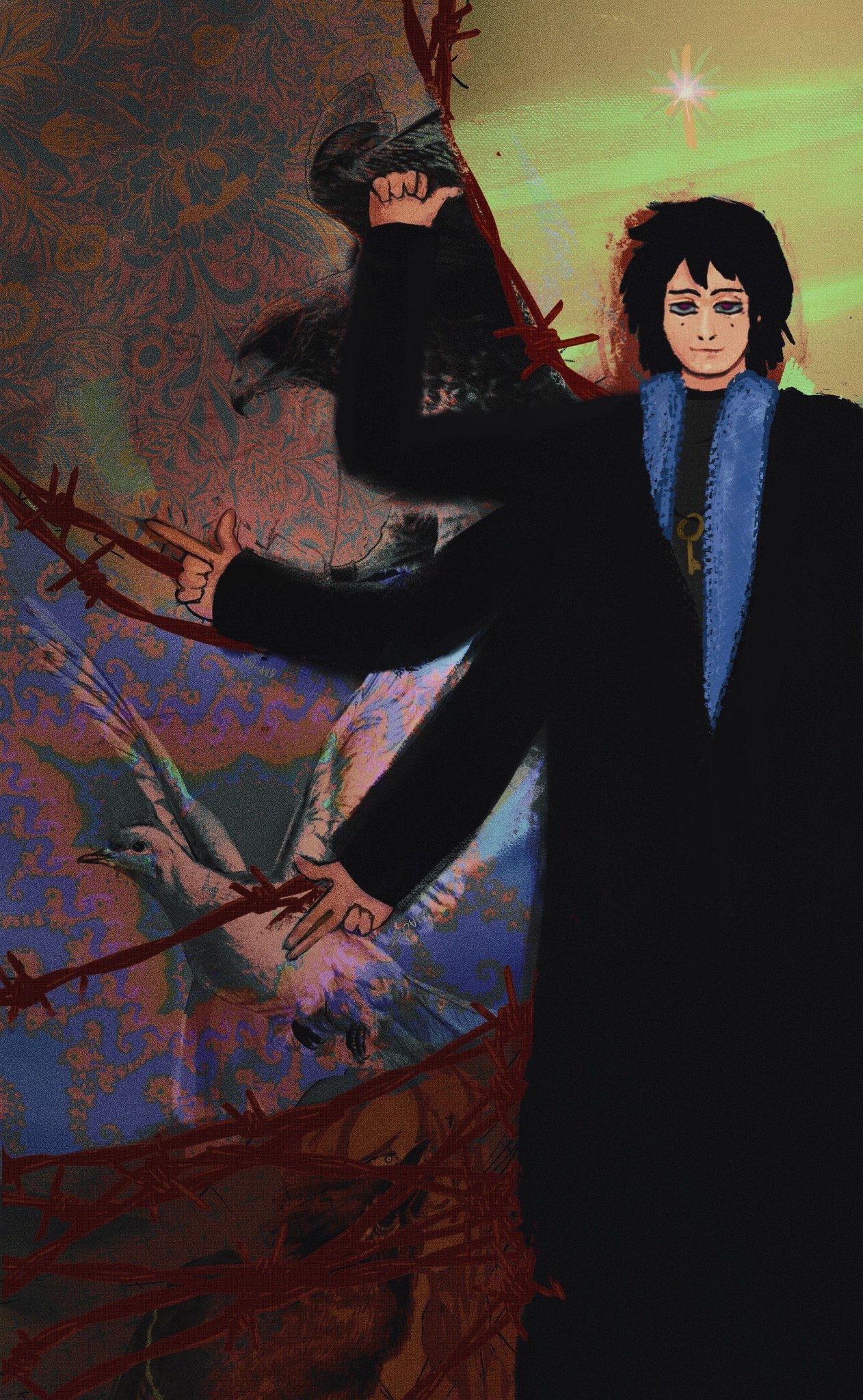 It was after a long night out with people Raph had met online. Her heavy boots dragged across the floor as she entered her bedroom, trench coat barely clinging to her shoulders. She slumped onto the kitchen stool she'd claimed for her room, deliberately avoiding to look behind her, at her bed. The hallucinations had become routine - tonight, she was too tired to face them.