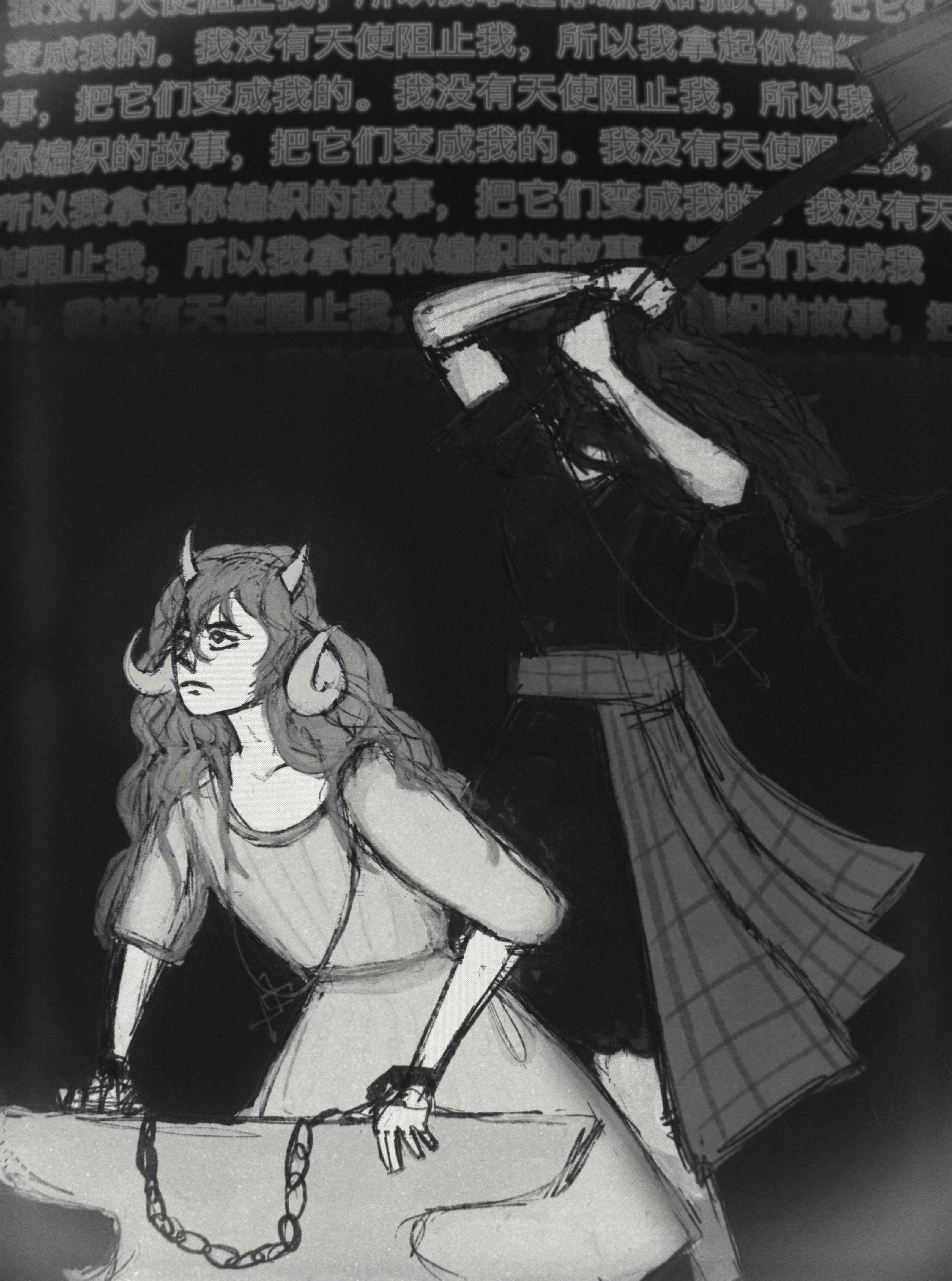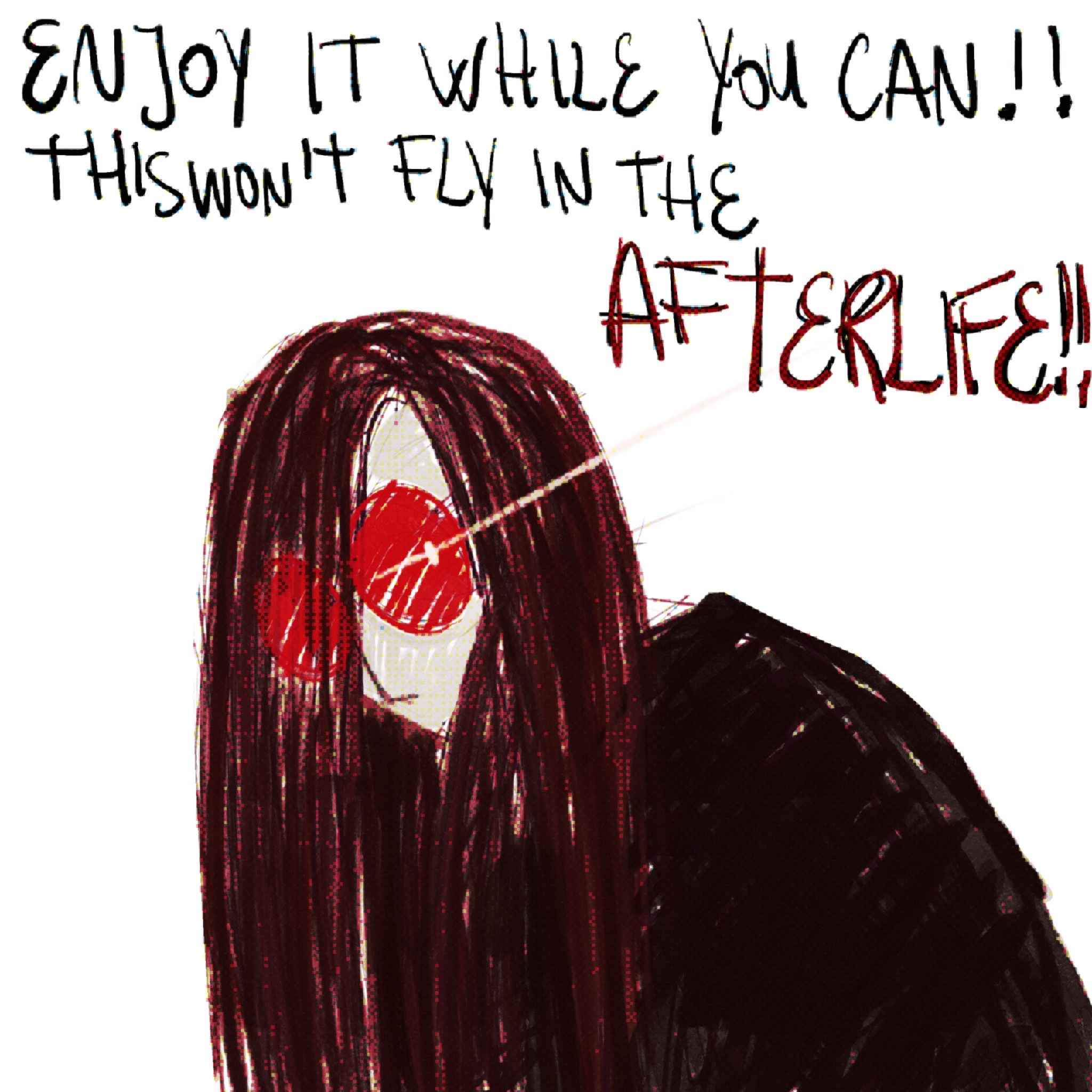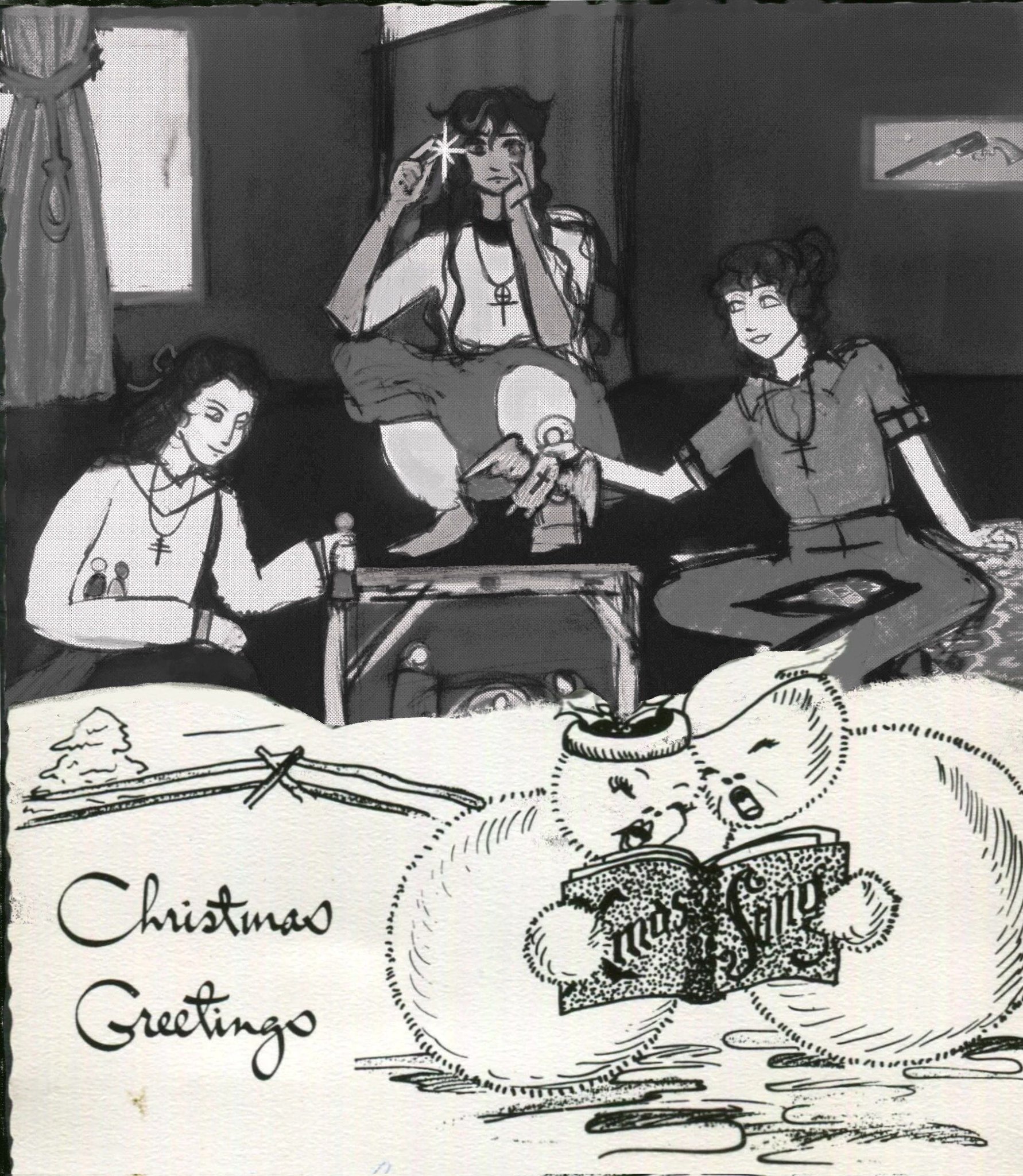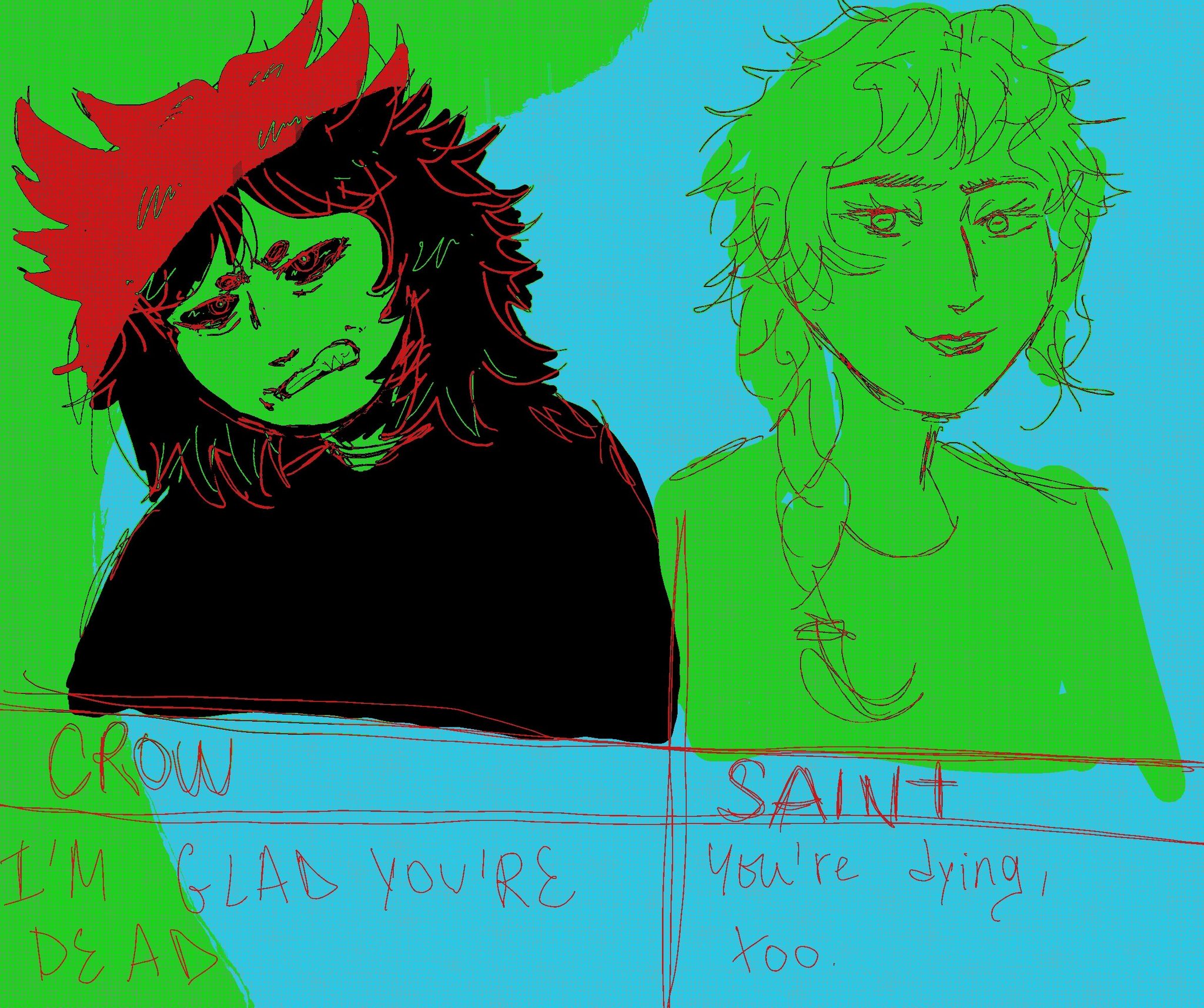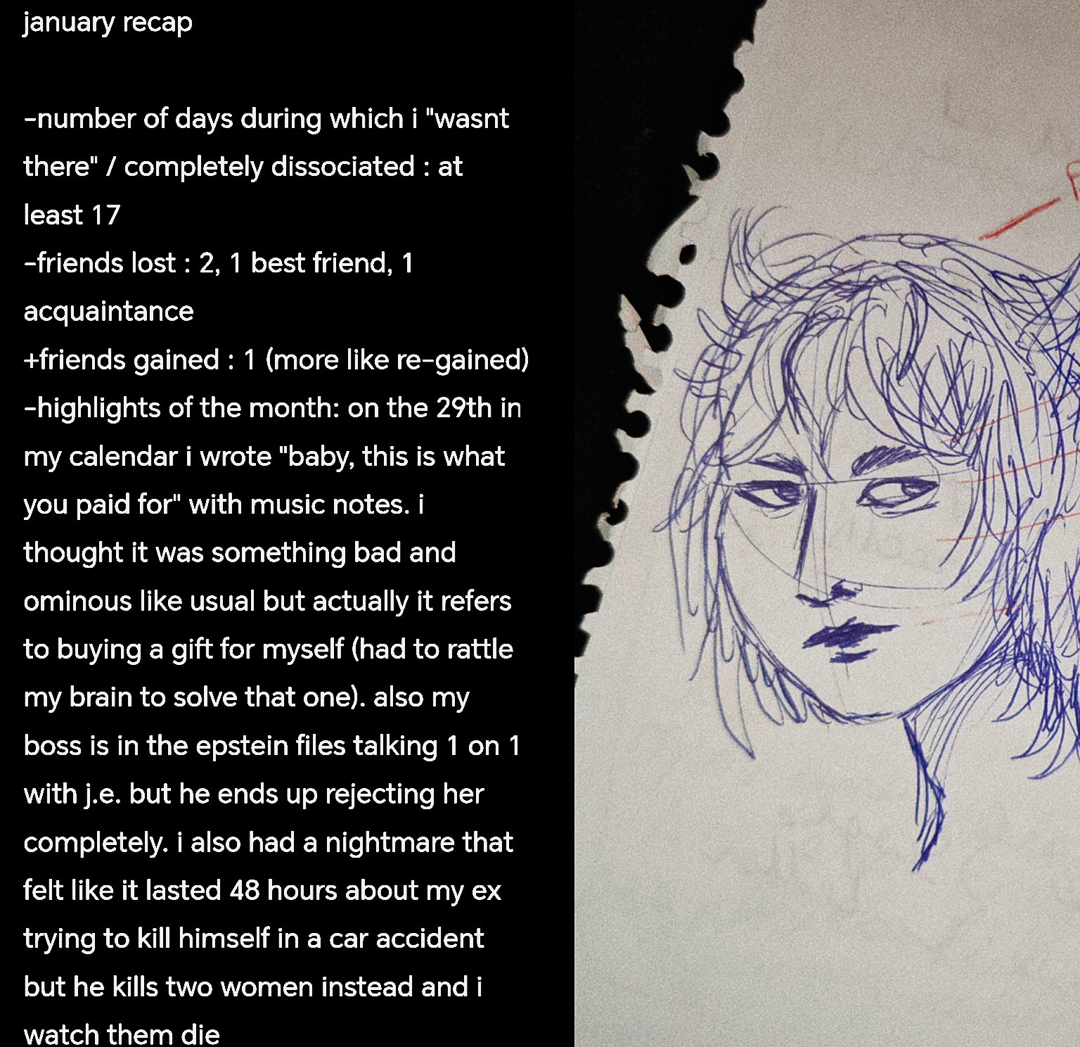 It was after a long night out with people Raph had met online. Her heavy boots dragged across the floor as she entered her bedroom, trench coat barely clinging to her shoulders. She slumped onto the kitchen stool she'd claimed for her room, deliberately avoiding to look behind her, at her bed. The hallucinations had become routine - tonight, she was too tired to face them.