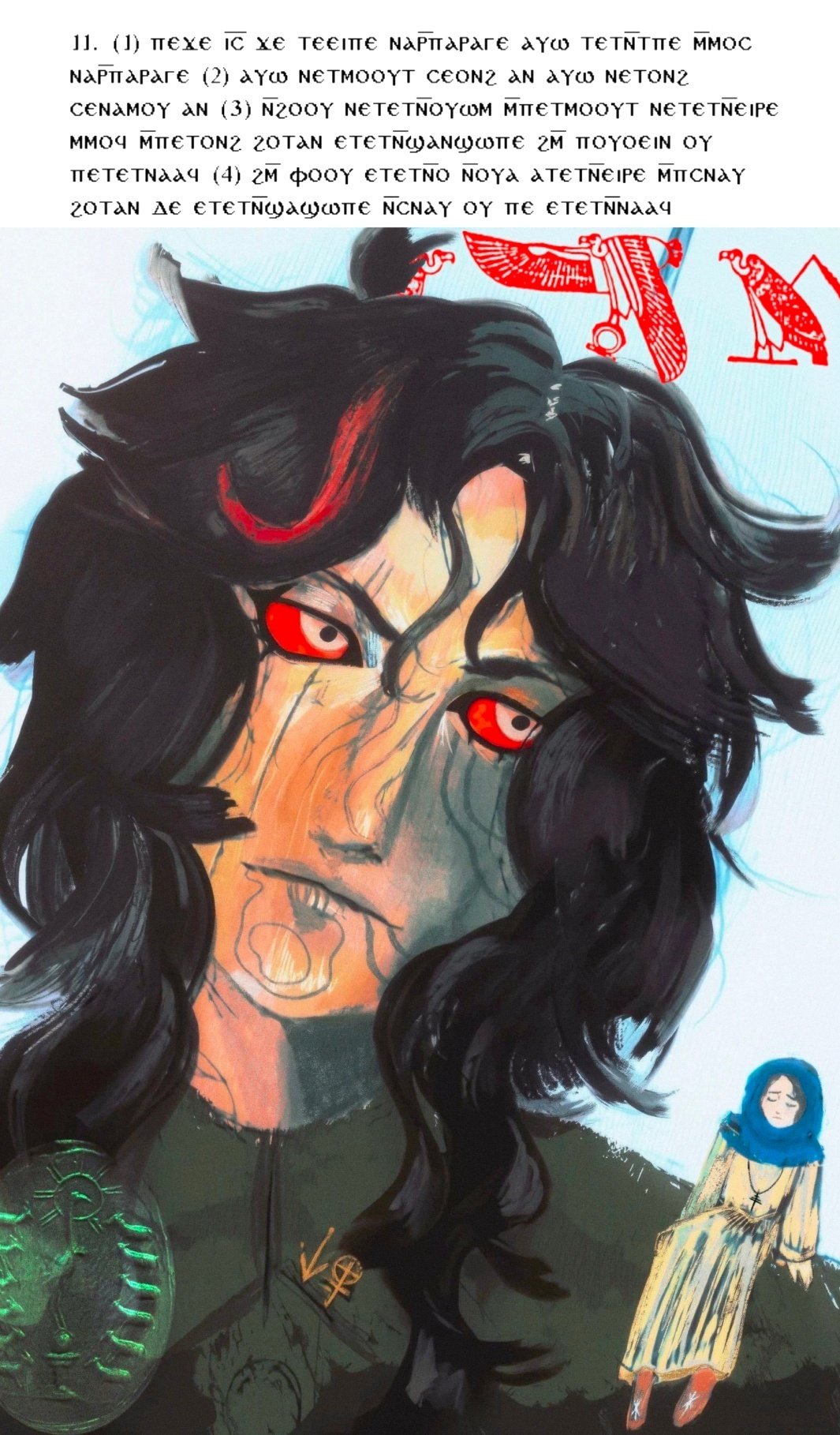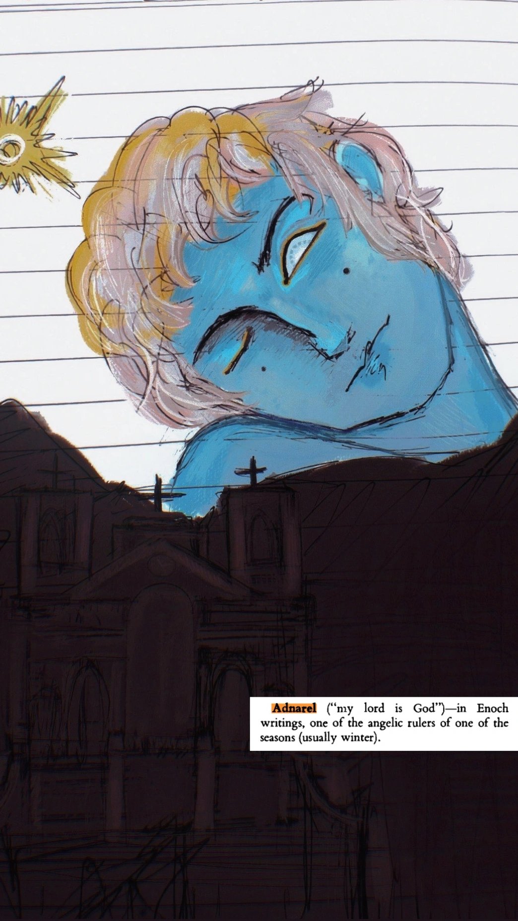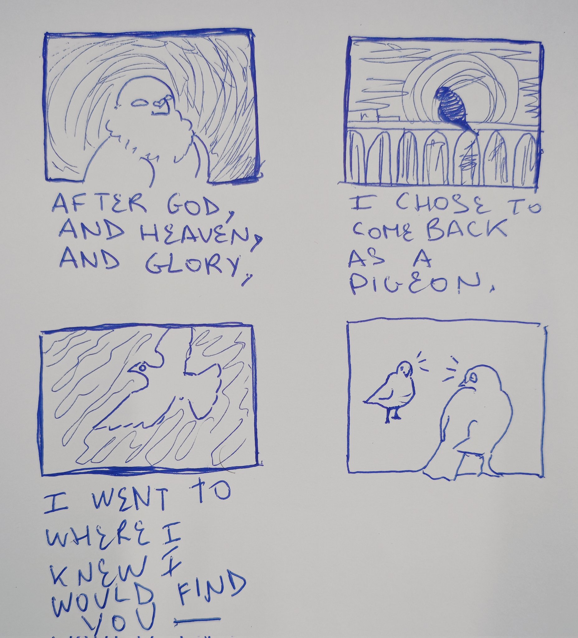 "Darling, God is a serpent, a pure soul, an egg and an explosion, and God's story is of a flood and a short trip to the underworld: in the corner of my eye, I see where our mortal realm ends and God's throne begins, where all the pretty colours are."